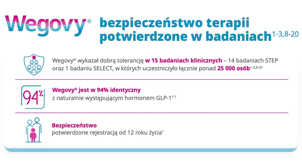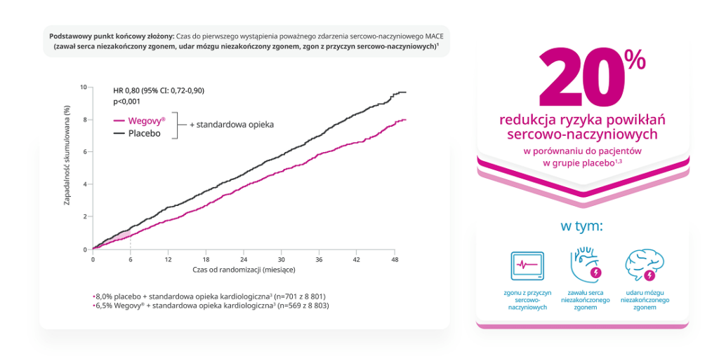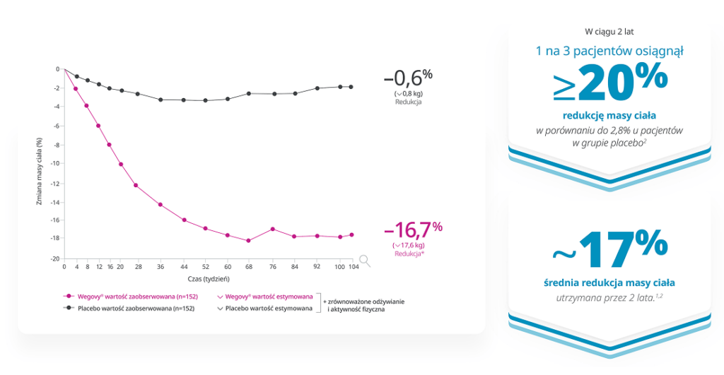 Średnia wyjściowa masa ciała: 105,6 kg dla ramienia Wegovy® oraz 106,5 kg dla ramienia placebo.2 Analiza trial product estimand (ocena efektu leczenia, jeśli badanie zostało przeprowadzone zgodnie z założeniami). Obserwowane wartości zostały zaraportowane tylko dla pacjentów, którzy ukończyli każdy punkt kontrolny badania.